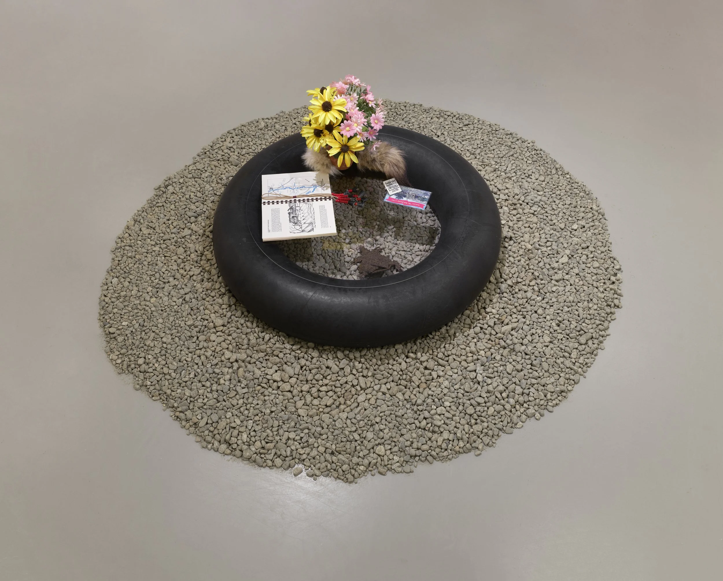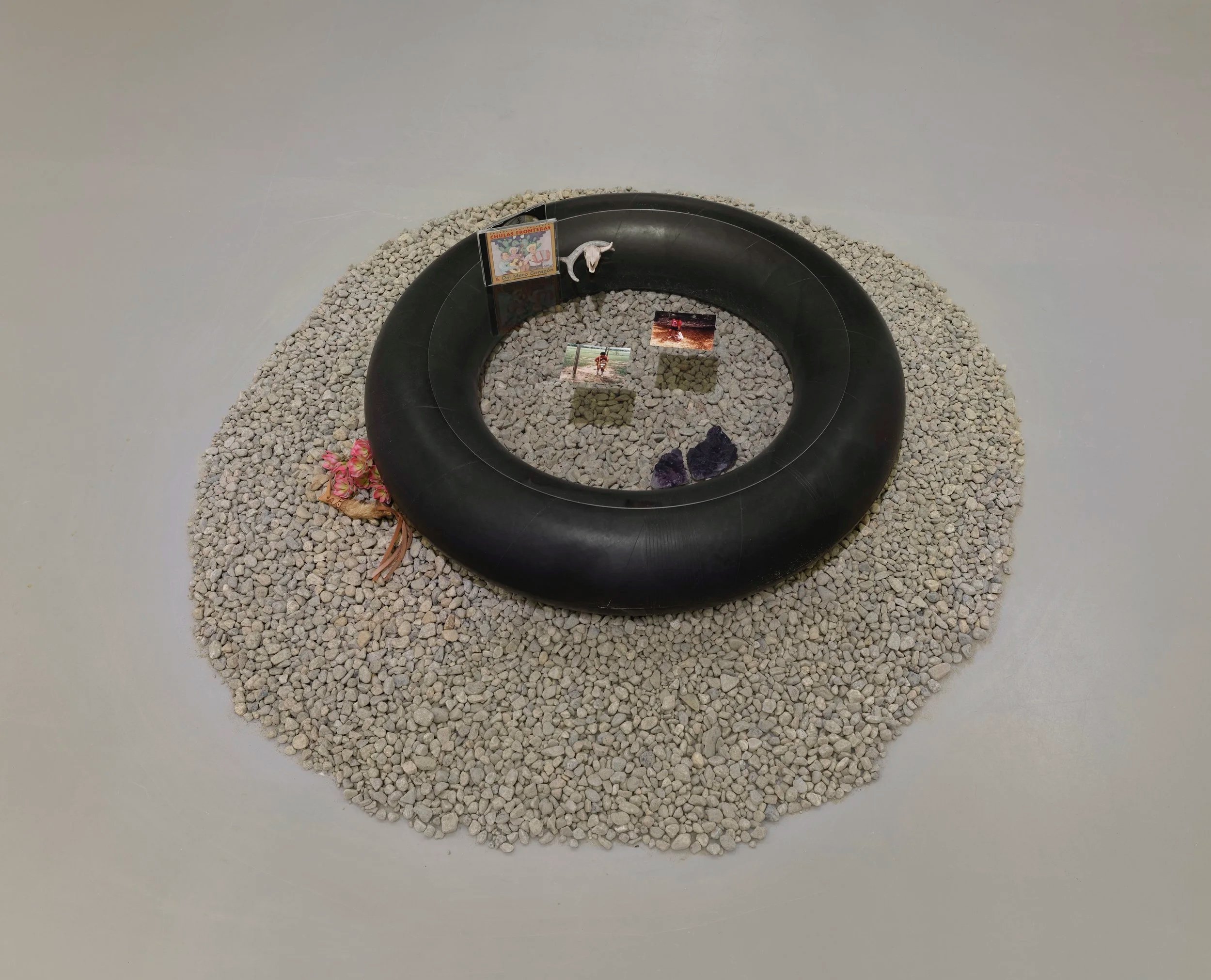 Inner Tube Vitrine I and II, 2024, truck tire inner tube, Plexiglas, artists’ archival materials (publications, family photographs, and ephemera) set in gravel. Sculptures by Anthony Romero with objects from the collections of Deanna Ledezma, Josh Rios, and Anthony Romero.