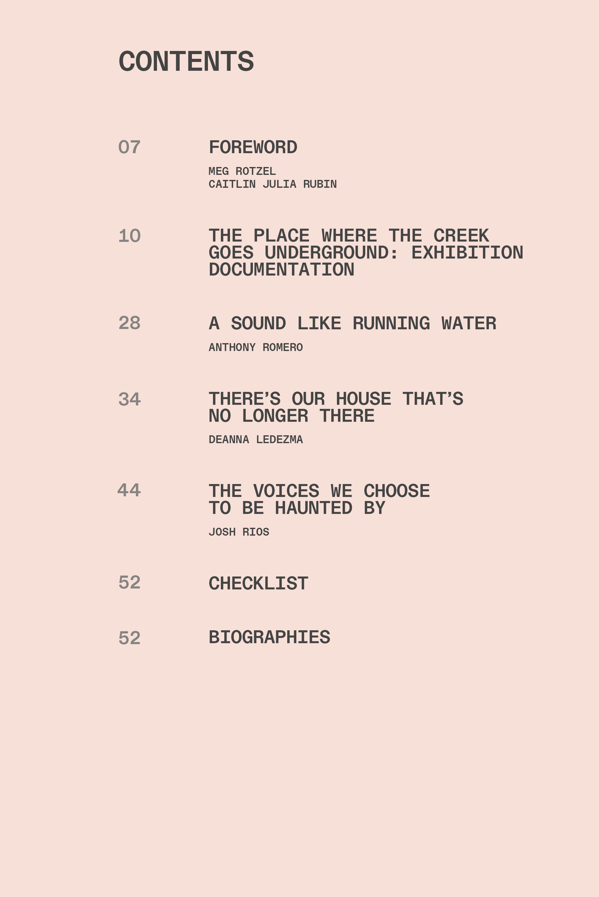 Place as Practice Research Collective (Deanna Ledezma, Josh Rios, and Anthony Romero), Exhibition booklet with three nonfiction essays, published in conjunction with The place where the creek goes underground, 2024, Harvard Radcliffe Institute. Designed by Cara Buzzell.
