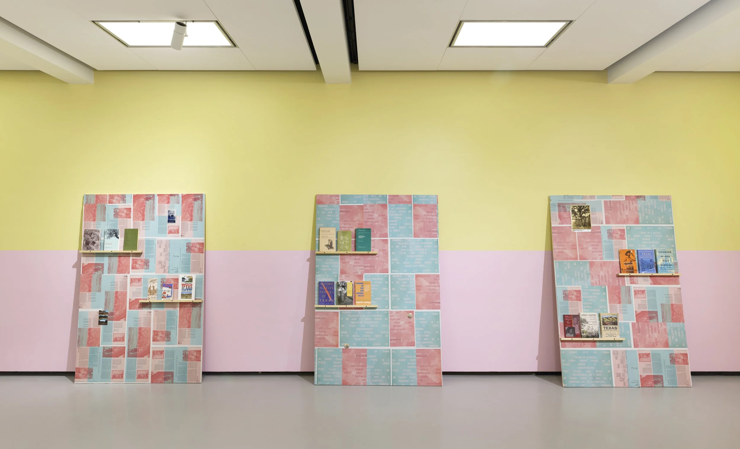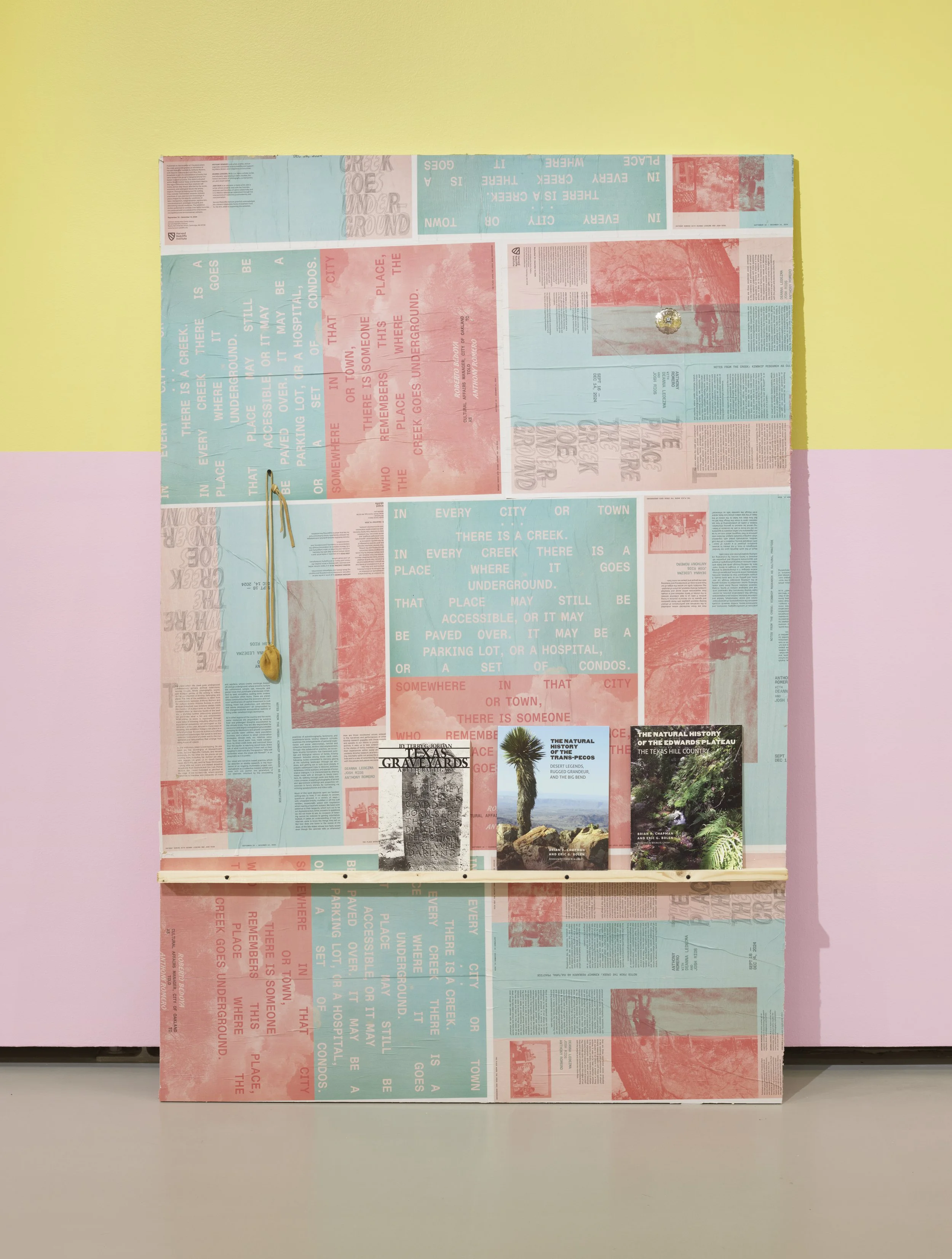 Place as Practice Research Collective (Deanna Ledezma, Josh Rios, and Anthony Romero), The place where the creek goes underground, 2024, Harvard Radcliffe Institute. Exhibition documentation by Julia Featheringill.