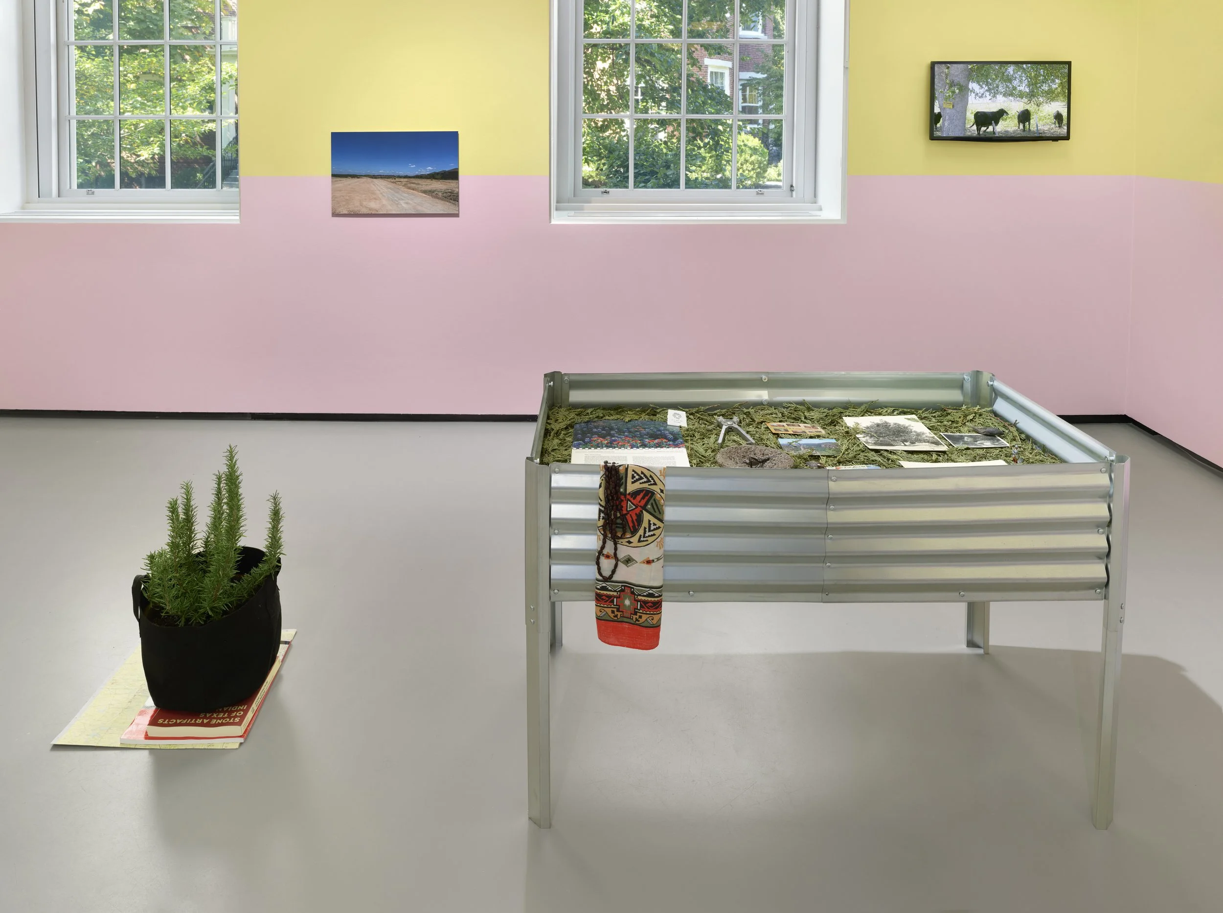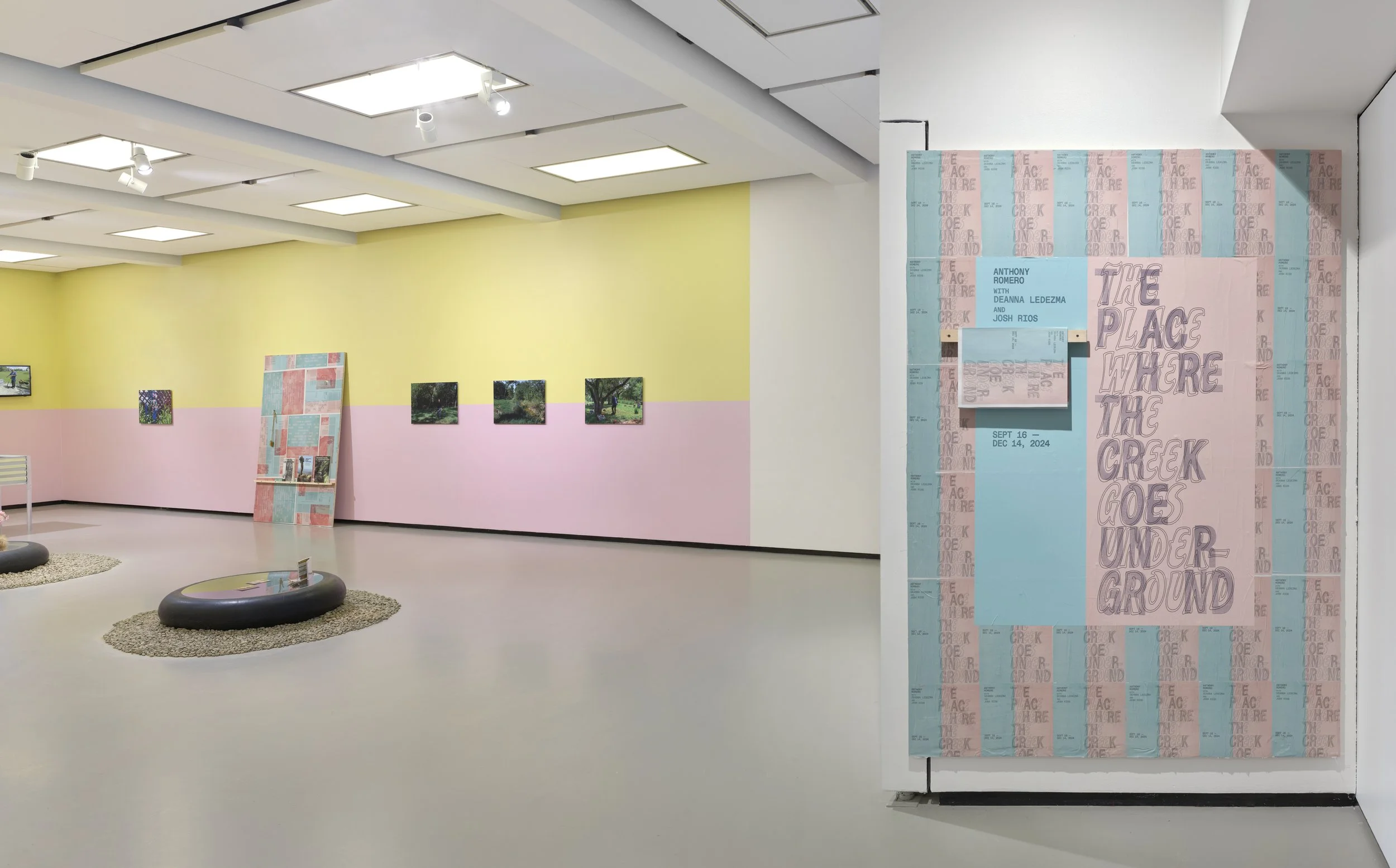 The place where the creek goes underground, curated by Meg Rotzel with Caitlin Julia Rubin, presents a series of newly commissioned works that form an archive of place-knowing, belonging, and kin-making. The project began with a series of conversations Anthony Romero held with Brown and Indigenous artists, activists, and theorists on subjects of decolonial methodologies, gentrification, displacement, and food sovereignty. This exhibition offers an opportunity for Romero and his collaborators Deanna Ledezma and Josh Rios to create a body of work emerging from intergenerational kin-based research situated within South-Central Texas and Northern Mexico—the region the artists and their relatives call home. Through multimedia installation and life writing, they consider how familial networks maintain practices of care and transmit intimate knowledge of place shaped by the conditions of labor, immigration, marginalization, agrotourism, overdevelopment, prolonged droughts, and diminishing natural resources. This exhibition invites audiences to consider how family histories are produced and circulated within specific and interwoven sociopolitical contexts.