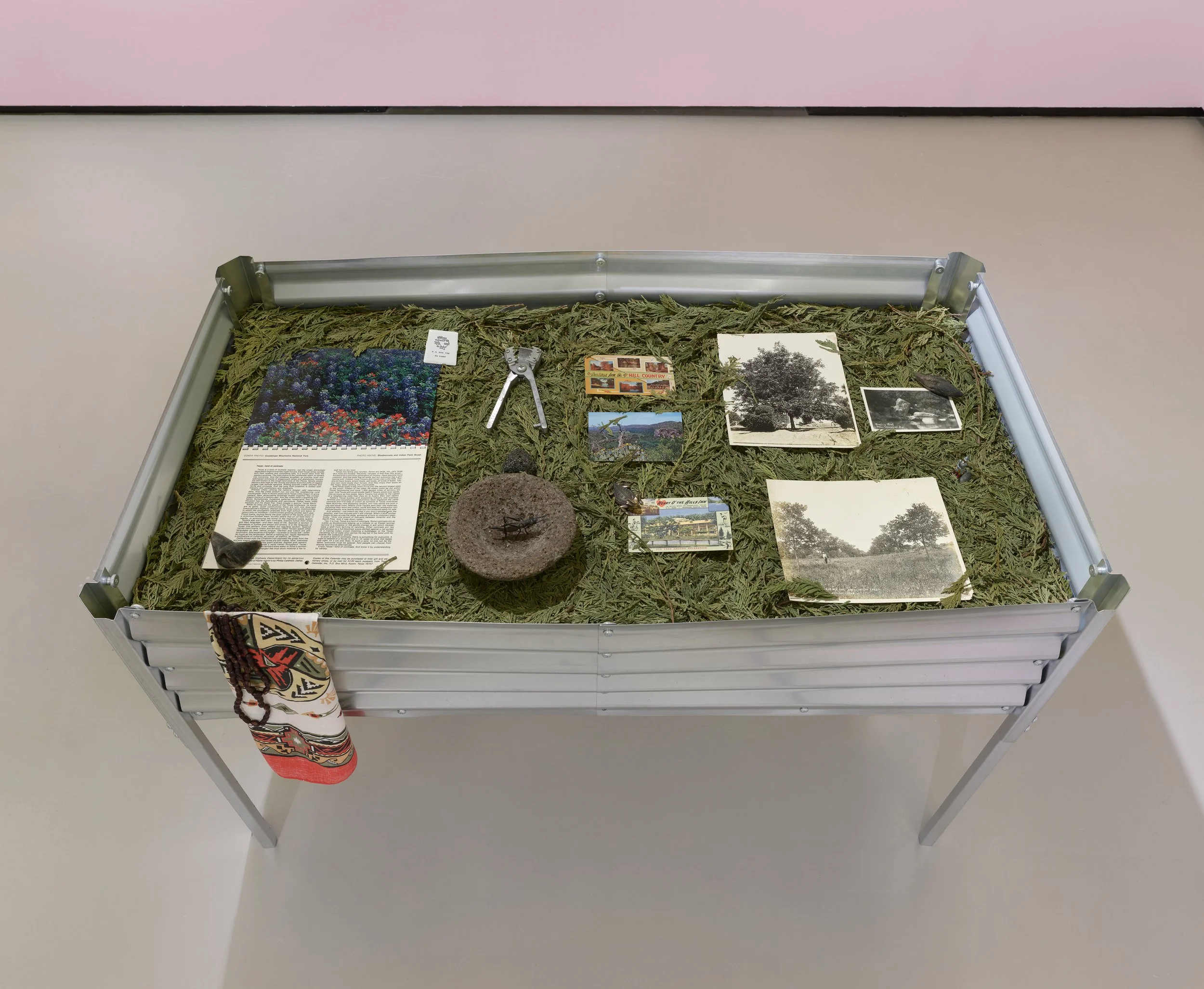 Raised Garden Bed Vitrine, 2024, raised garden bed, Plexiglas, artists’ archival materials (publications, family photographs, and ephemera), set in cedar leaves. Sculptures by Anthony Romero with objects from the collections of Deanna Ledezma, Josh Rios, and Anthony Romero.